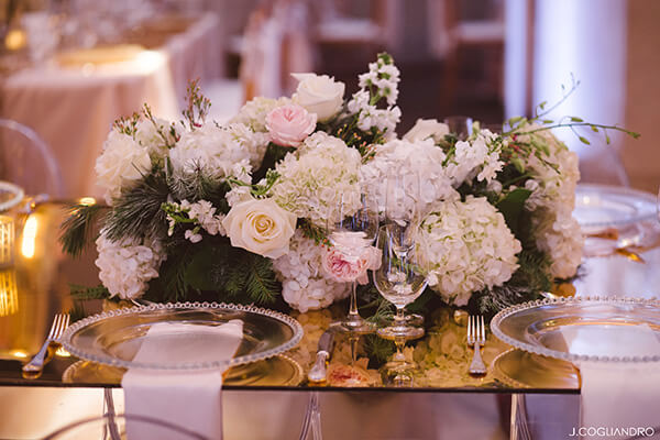 Tempt with texture. Using whimsical textures like fur combined with silk will give your romantic reception an upscale feel. Bring soft, feminine texture and visual interest to often- overlooked areas like bathrooms, hallways and buffet tables, with “luscious, fluffy flowers” like peonies and hydrangeas, she adds.
