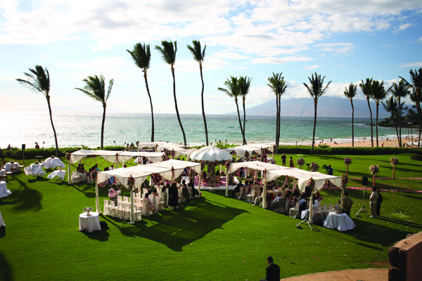 When it’s time to celebrate, the resort’s Molokini Gardens beckon revelers with “a beautiful grassy lawn and panoramic views of the Pacific Ocean surrounded by palm trees,” Leuenberger says. If something a little more formal is part of your Maui destination wedding plan, opt for the resort’s Grand Dining Room—“an elegant outdoor reception area which features panoramic views of the Pacific Ocean, and provides a spectacular backdrop for formal sit-down meals or festive buffets, as well as ample space for up to 100 guests to dance the night away.”