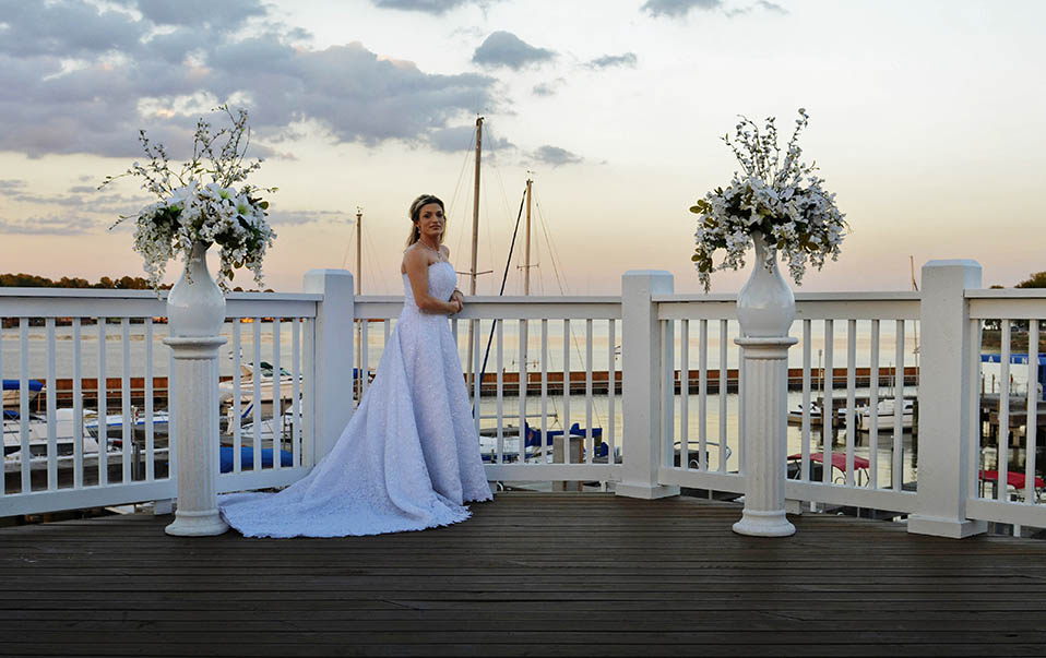 “Strolling out onto any one of the marina piers assures a breathtaking photo opportunity,” Winkler adds, while the venue’s Tiffany-blue bridal dressing room, “decorated with crystal chandeliers and marble makeup vanities, is a favorite place for capturing the bride, bridesmaids and family preparing for their special day.”