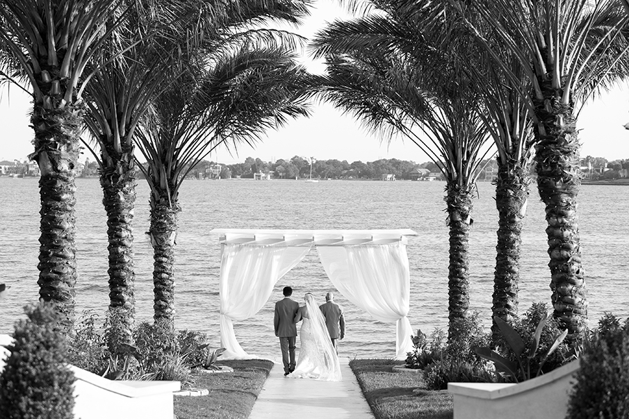 Set on two and a half scenic acres on the shores of sparkling Clear Lake, Waters Edge feels more like a lush tropical resort than a wedding venue. Couples love to make use of the waterfront lawn for ceremonies, outfitting it with a chiffon-draped, chandelier-accented white arbor, and punching-up the palm-tree-lined aisle with twinkle strands and color-changing uplighting, notes assistant event manager Kayla Taylor. Then, “Once everyone is ready for the reception, we open the sliding glass wall that leads into the ballroom, which has the same gorgeous views of the waterfront,” she adds.